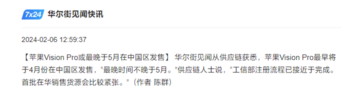 供应链方面还表示,Vision Pro“工信部注册流程已接近于完成。首批在华销售货源会比较紧张”。不久之前的 2 月 2 日,库克到访美国纽约第五大道 Apple Store,当被问及 Vision Pro 何时在中国上市时,库克回应:“不确定具体时间,但是很快了。”