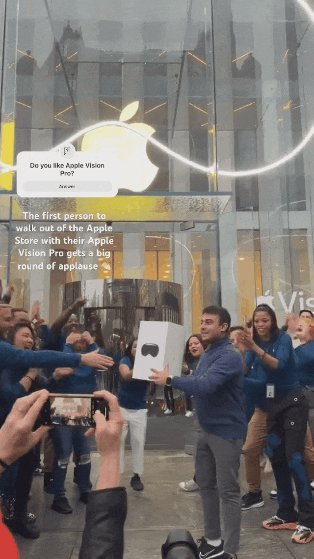 2月2日,万众瞩目的Vision Pro终于开始发售了。不仅是美国本地人士提前老早到店门口排队,很多国内的同胞也是特意打飞的到美国,通宵等待这款新产品发售的一刻。9点倒计时结束,库克现身美国纽约苹果第五大道零售店的门口,几分钟后,第一台Vision Pro被捧了出来。围在周围的人群爆发出热烈的欢呼,场面不亚于某明星的粉丝见面会。