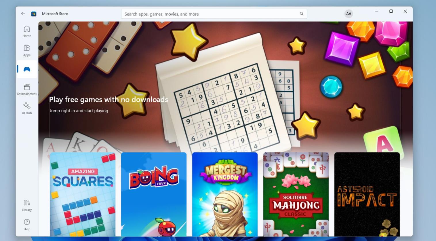 近日,微软商店在 Windows 11 上推出了新功能——“即时游戏”。这一功能允许用户在无需下载安装的情况下,直接在商店内试玩休闲游戏。目前已有 69 款游戏支持此功能,它们均带有橙色标志,并归类于“收藏”版块。