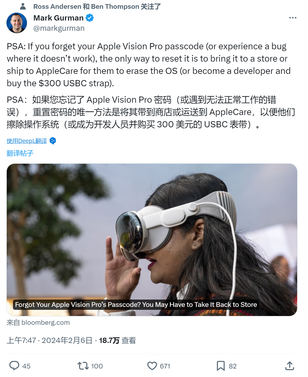 除此之外,物流、售后服务都需要时间来适应和调整。Vision Pro 为有视力矫正需求的用户提供蔡司光学处方镜片。目前,蔡司只接受美国眼科护理专家开出的视力处方,也仅运送至美国地址。苹果零售店在 Vision Pro 的购买过程中也发挥着巨大作用。彭博社首席科技记者报道称,如果用户不幸忘记了密码,对不起,重置的唯一方式是将设备送回苹果零售店或售后来解决。看来,正确培训一批零售员工也需要时间。
