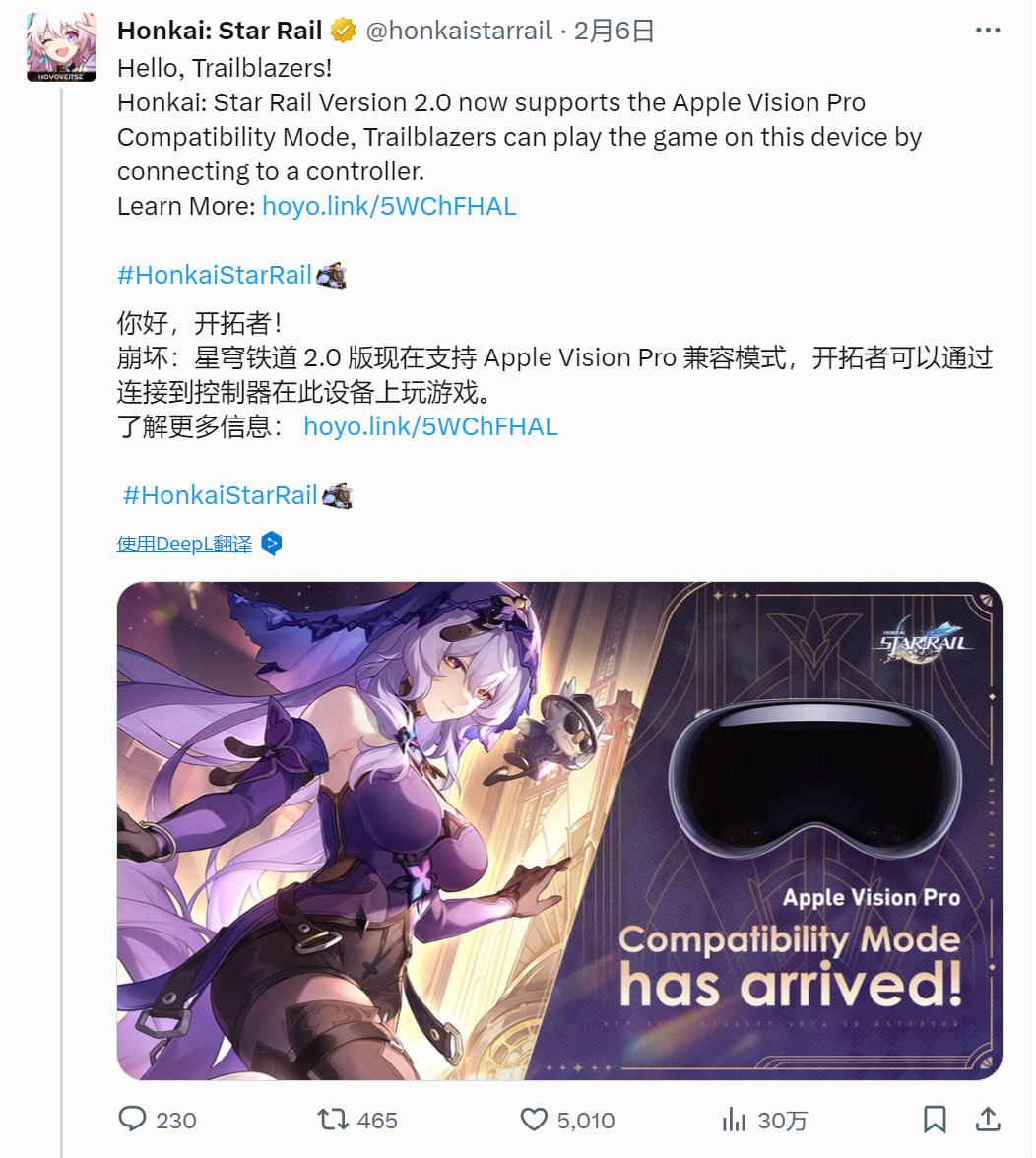 《 崩坏: 星穹铁道》( Honkai:Starrail ) 也于 2 月 6 日登陆 Apple Vision Pro。 该游戏已迅速成为最受欢迎的 手机游戏之一,游戏在 iOS 设备上拥有庞大的玩家基础,他们也计划通过 Apple Vision Pro 扩大其在苹果生态系统中的影响力。