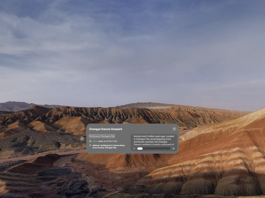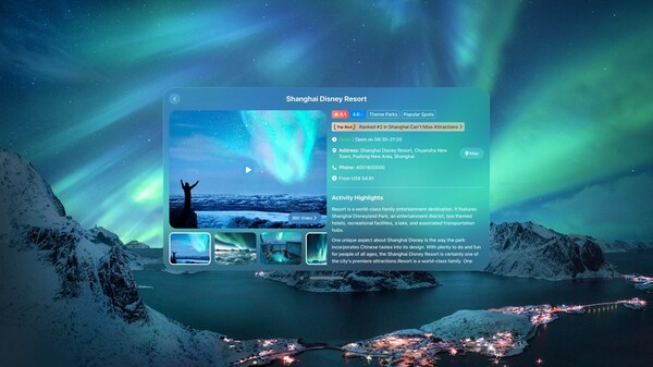 初始版本的第一批国内外旅游景点,包括桂林景观、德田瀑布、张掖丹霞和成都大熊猫基地。全球用户可以通过 Vision Pro 体验这些风景,并了解景点背景信息。携程还声称,程序允许用户以同样的方式体验珠穆朗玛峰、撒哈拉沙漠和南极洲冰川等地的风景。