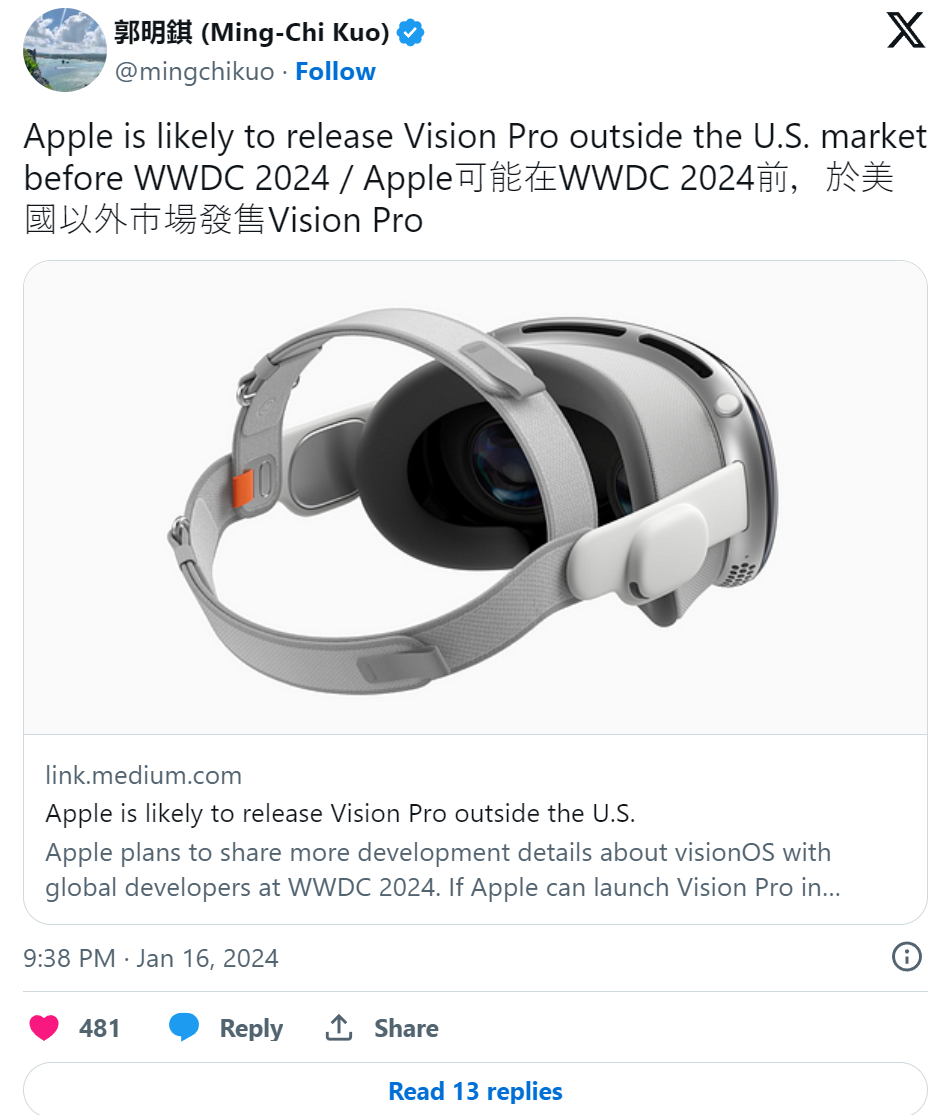 https://medium.com/@mingchikuo/apple-is-likely-to-release-vision-pro-outside-the-u-s-d8d2ed8f5f01
