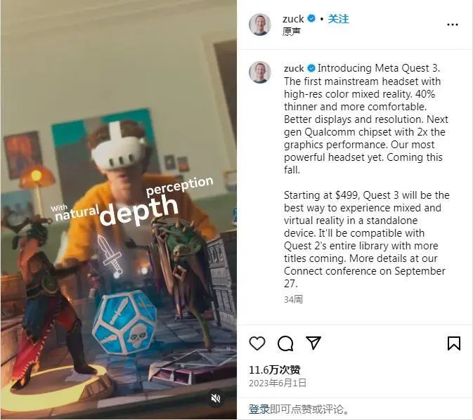 抛开之前的行业预测、供应链消息等,Quest 3在大众层面的正式亮相,是去年6月1日Meta CEO扎克伯格在社交平台的发文,首支官方预告片也随文发出。彼时,正值第三届Meta Quest Gaming Showcase游戏展会召开之际。