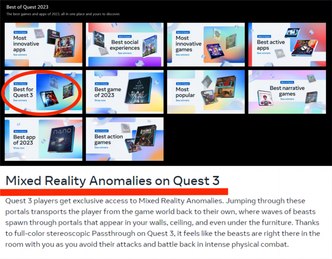 去年12月,Meta公布了Quest Store 2023年度佳作榜单,该榜单分有10个子类,共计50余款作品入选。其中,“Quest 3最佳”作为一个单独子类出现。上个月,Meta发布的《阿斯加德之怒2》官方玩家指南中,Quest 3用户专属MR体验同样是一个单独章节。