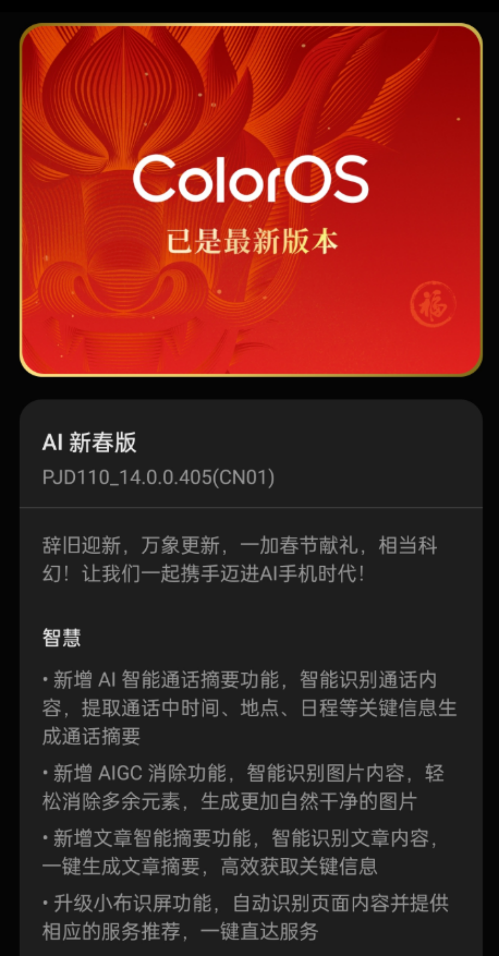 据介绍,ColorOS AI新春版带来多项AI功能,包括AI消除、新小布助手、AI 通话摘要、小布照相馆、小布AI贺卡等。