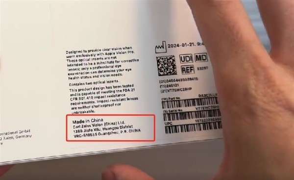 在苹果Vision Pro的包装盒的信息栏,以及本地一侧,都有”Made in China“的字样,说明苹果Vision Pro和苹果的其他设备一样,是由苹果设计,在中国组装生产的。此前就有爆料称,此次苹果Vision Pro是由立讯精密代工,首批产品实在昆山的立讯精密工厂生产的。