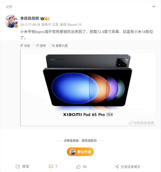 IT之家 2 月 11 日消息,据博主 @李昂昂昂啊 ,小米一款平板电脑新品的官图现身海外官网,其型号为小米平板 6S Pro。