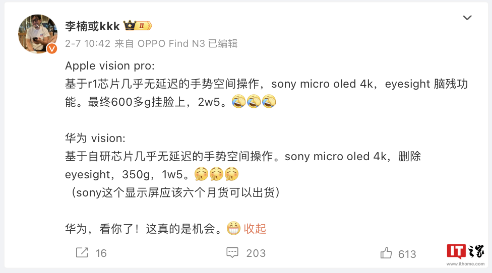 据悉,这款头显将采用华为自研芯片,空间操作“几乎无延迟”,并配备索尼 4K Micro-OLED 屏幕(相关屏幕预计将在 6 个月内出货),重量为 350 克,相对于苹果 Vision Pro 头显删除了“eyesight”功能。