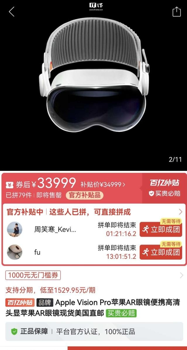 而根据IT之家小伙伴投稿,当下这款头显已经上架拼多多“品牌百亿补贴”,售价 34999 元,并提供“1000 元无门槛券”,券后价 33999 元。