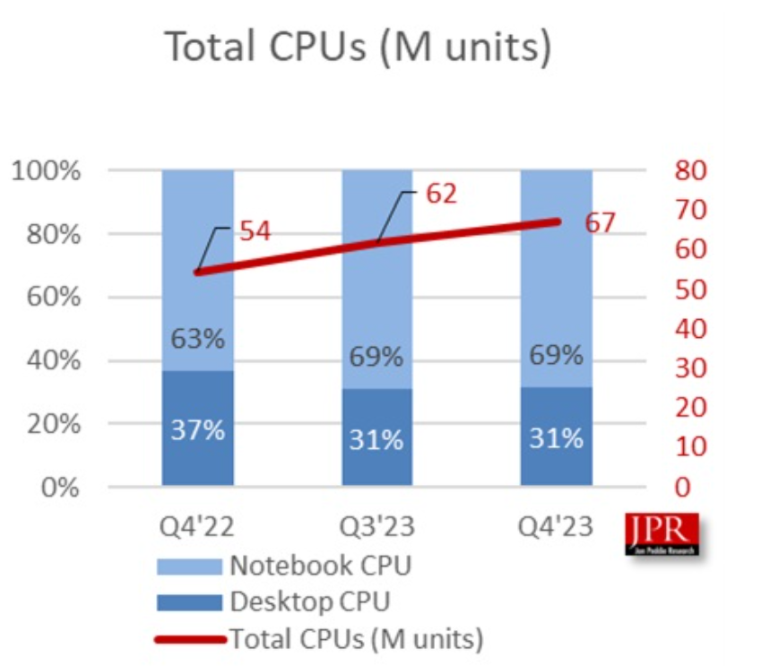 PC市场的整体回暖自然也带动了CPU市场,根据市场调查机构Jon Peddie Research 公布的最新报告,2023年第4季度全球PC客户端CPU出货量达到6725万颗,环比增长9%,同比增长24%,远超市场的预期。