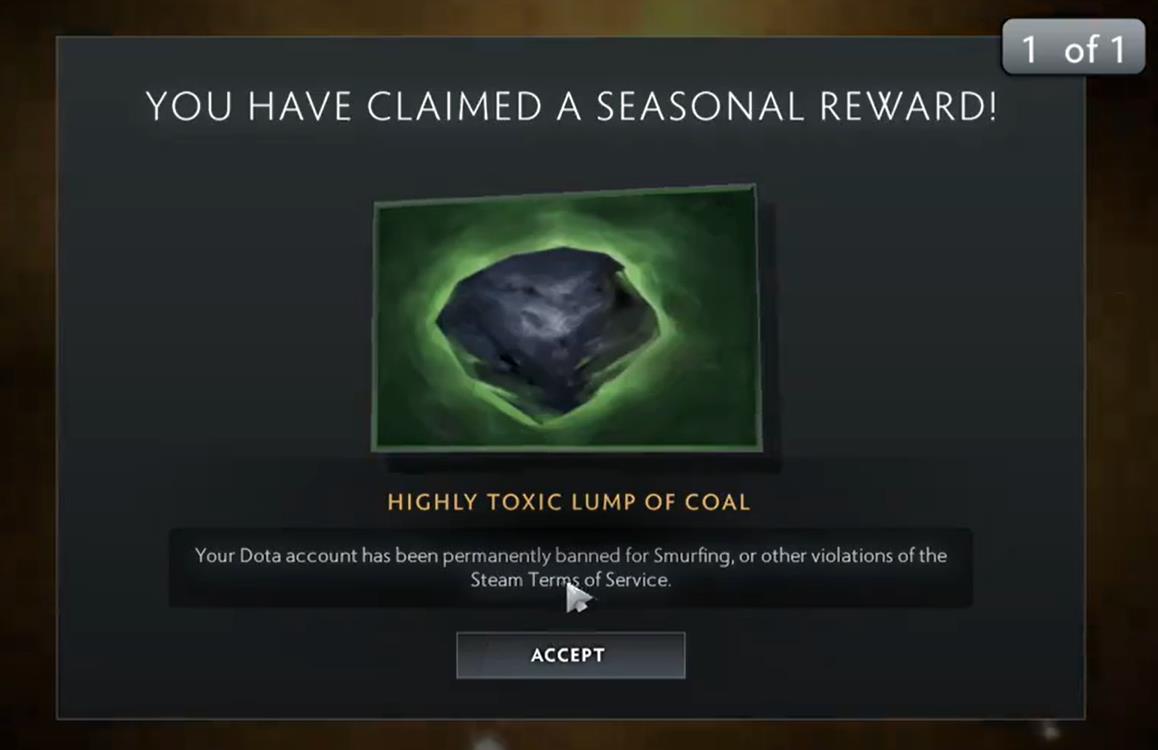 值得注意的是,《DOTA2》还会向所有玩家发放一份“季节性奖励”,但淘气王们打开礼物盒时,他们会收到一个“剧毒”煤炭块,并且会被永久封禁(VAC)。