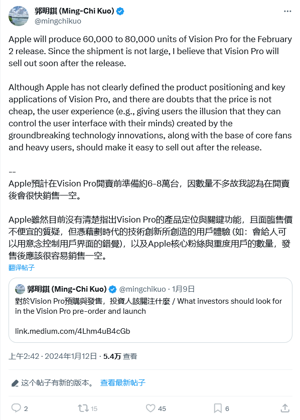 IT之家今年 1 月报道,郭明錤发布推文,表示苹果 Vision Pro 头显的初期备货约为 6-8 万台,由于备货数量并不多,认为在上市初期会出现脱销现象。