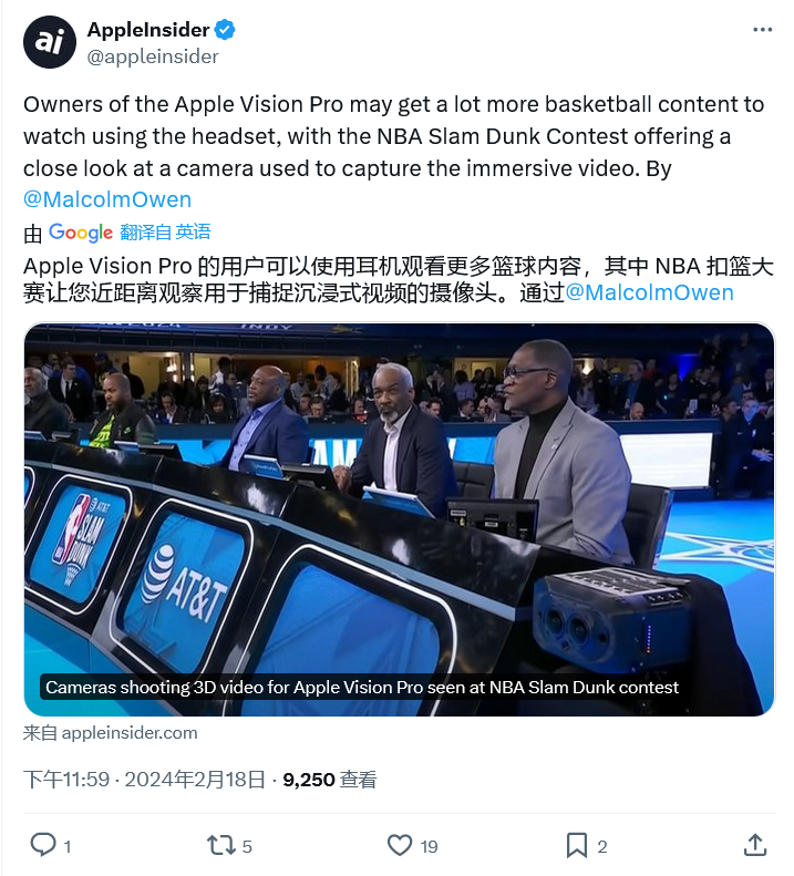 文章来源于互联网:凤凰网-神秘设备现身NBA扣篮大赛,有望为苹果Vision Pro头显录制3D空间视频