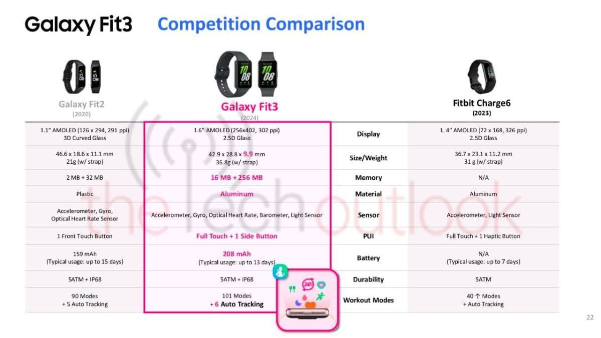 三星 Galaxy Fit3 健身手环尺寸为 42.9 x 28.8 x 9.9 毫米,重量仅为 36.8 克。在做工方面,显示屏将采用 2.5D 玻璃,表身将由铝合金制成。