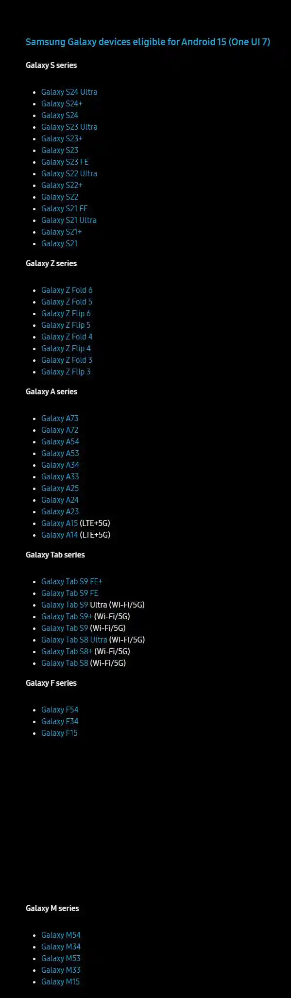 三星通常为运行最新Android版本的设备提供至少两个主要系统的升级。因此,运行Android13的设备有很大机会升级到Android15。此外,享受四年操作系统升级的旗舰和中端手机也将有望升级。预计2024年推出的所有Galaxy设备也将支持Android15。