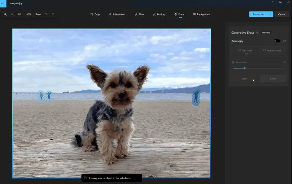 与谷歌和三星在移动设备上的AI橡皮擦工具相比,Microsoft的版本更具优势。它使得用户可以在台式机或笔记本电脑上享受到AI驱动的照片橡皮擦功能,无需局限于移动设备。使用起来也非常简单,只需在“照片”应用中启动图像编辑器,选择“擦除”选项,然后使用画笔在要删除的元素上创建蒙版即可。