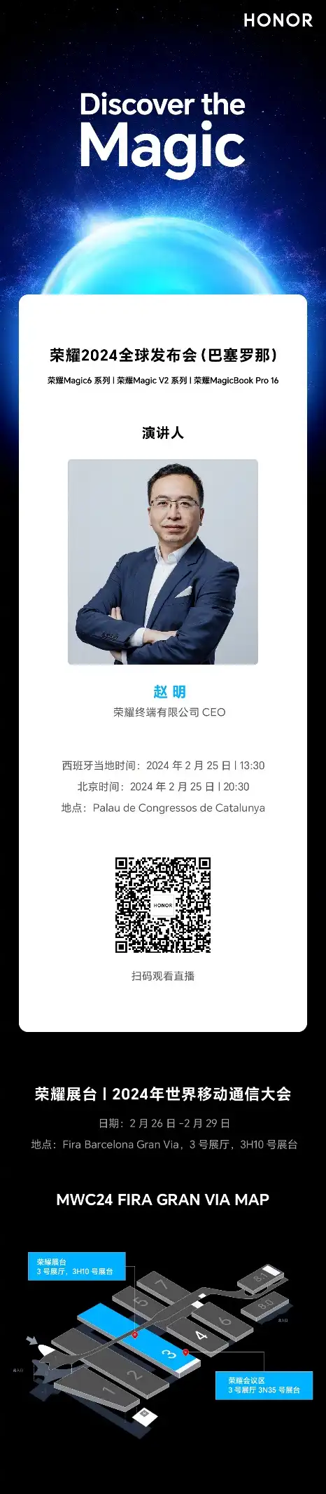 2月23日,荣耀手机官方发布了备受期待的MWC2024荣耀全球发布会的信息,确认发布会时间为北京时间2月25日晚20:30。据荣耀官方消息显示,此次发布会将聚焦于展示荣耀的AI战略和旗舰产品,呼吁全球用户共同见证科技魔法的奇迹。