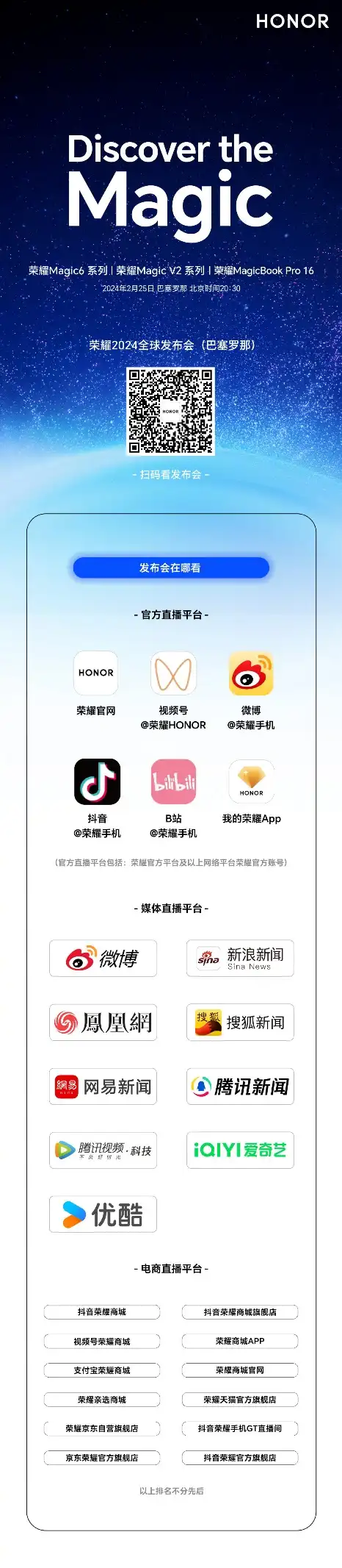 据荣耀官方发布的海报显示,本次发布会的主题为“Discover the Magic”,一经发布就引起了网友的热议。有很多网友对荣耀即将创造的魔法奇迹表示期待。海报还显示此次发布会的主讲人将是荣耀CEO赵明,也从侧面可以证实发布的产品将展示荣耀在软硬件方面的最强创新。