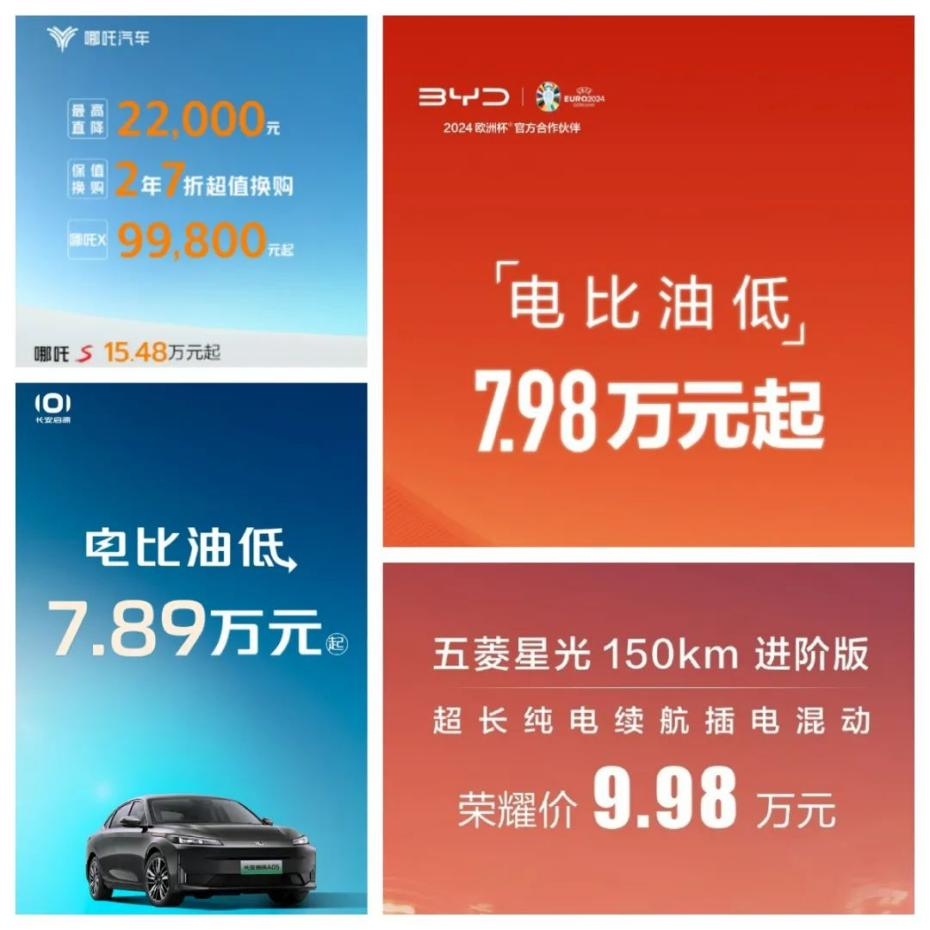 “老大”带头降价后引起了巨大的市场反应,上汽通用五菱、长安启源、吉利、哪吒等多家车企马上跟进。