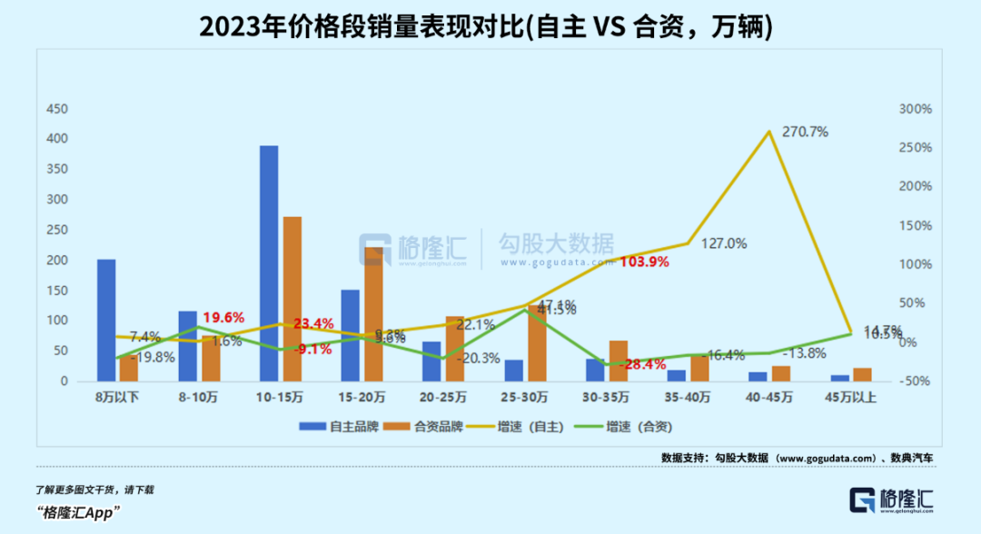 2023年自主车型销量首次超过千万辆,市场份额超过49%,首次超过合资品牌。比较去年自主品牌和合资品牌在不同价格段的销量表现,我们可以看出两个事情。