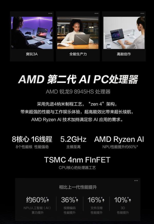 在配置方面,新款ROG幻14 Air搭载最新一代AMD锐龙9 8945HS处理器,采用Zen4架构+4nm工艺打造,拥有8核16线程,显卡则提供英伟达RTX4050和RTX4060两款可选。新机最高还提供32GB+1TB的储存组合。