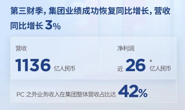 事实上,截至2023年12月31日的2023/24财年第三财季业绩显示,联想集团营收1136亿人民币,同比增长3%;净利润近26亿人民币,盈利能力连续两个季度实现环比改善。这也是在五个季度的下跌之后联想重回增长轨道,验证了联想转型战略的成功。