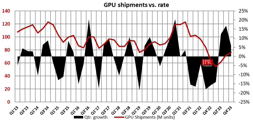 CPU 出货量复苏势头更加强劲,季度环比增长 9%,同比增长 24%。Jon Peddie Research 没有提供 AMD 和英特尔 CPU 的具体数据,但 Mercury Research 表示 AMD 在 2023 年表现非常好,尽管其第四季度的表现与第三季度大致持平。