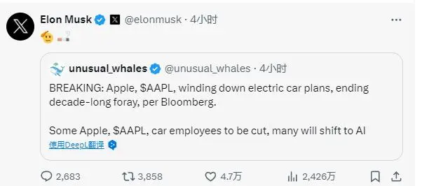 今日,全球知名科技记者马克·古尔曼爆出一则重磅消息:苹果已决定取消其投入巨大的电动汽车项目。此消息一出,立即引起了科技界和市场的广泛关注。有意思的是,马斯克用两个表情回应苹果取消造车。