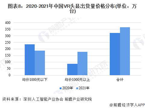 根据深圳市人工智能产业协会的数据,2021年中国VR头显单价1000元以上产品出货量177万台,同比增长103.6%,占总销量的48.5%;VR头显单价1000元以下出货量188万台,同比下降19.9%,占总销量的51.5%。说明虚拟现实(VR)设备的整体价格有所上升,主要是中高端产品的出货量增长所致。未来,随着VR设备生产技术的进一步提升,使得VR设备制造成本降低,VR设备的市场价格或将有所降低。