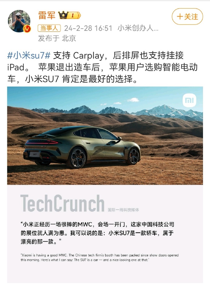 总之,随着苹果退出造车计划,智能电动车市场的竞争将更加激烈。小米SU7的支持Carplay和可挂接iPad的功能将成为其竞争优势之一,期待小米在未来能够为用户带来更多创新和惊喜。