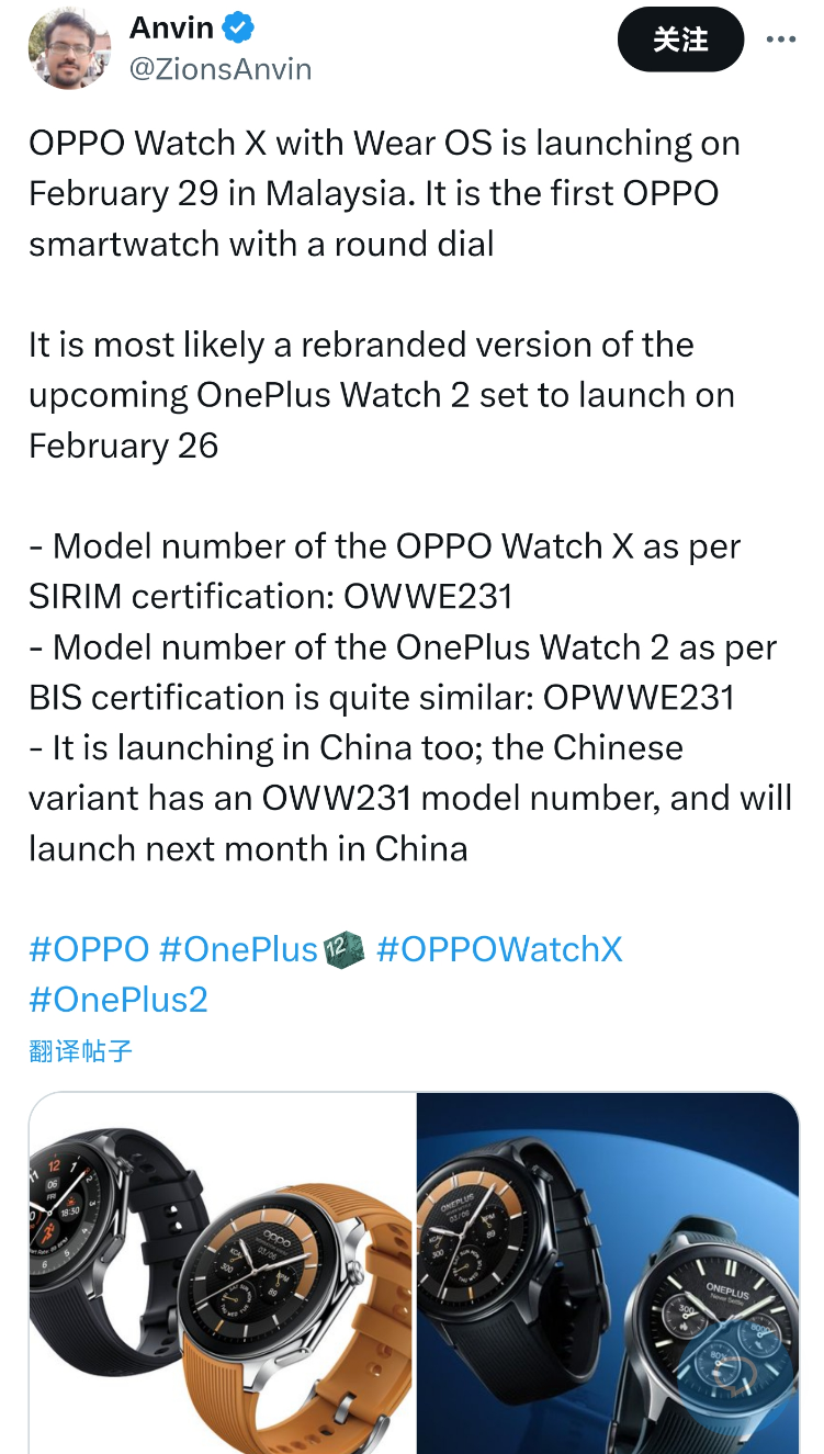 据数码博主@MlgmXyysd所述:OPPO Watch X就是一加手表 2的“兄弟”机型,不仅如此,它们的型号非常接近。一加手表 2的海外版的型号是OPWWE231,而OPPO Watch X的海外版则是OWWE231,这两款都搭载了Wear OS。至于OPPO Watch X的中国版型号是OWW231,它搭载的是ColorOS for Watch。
