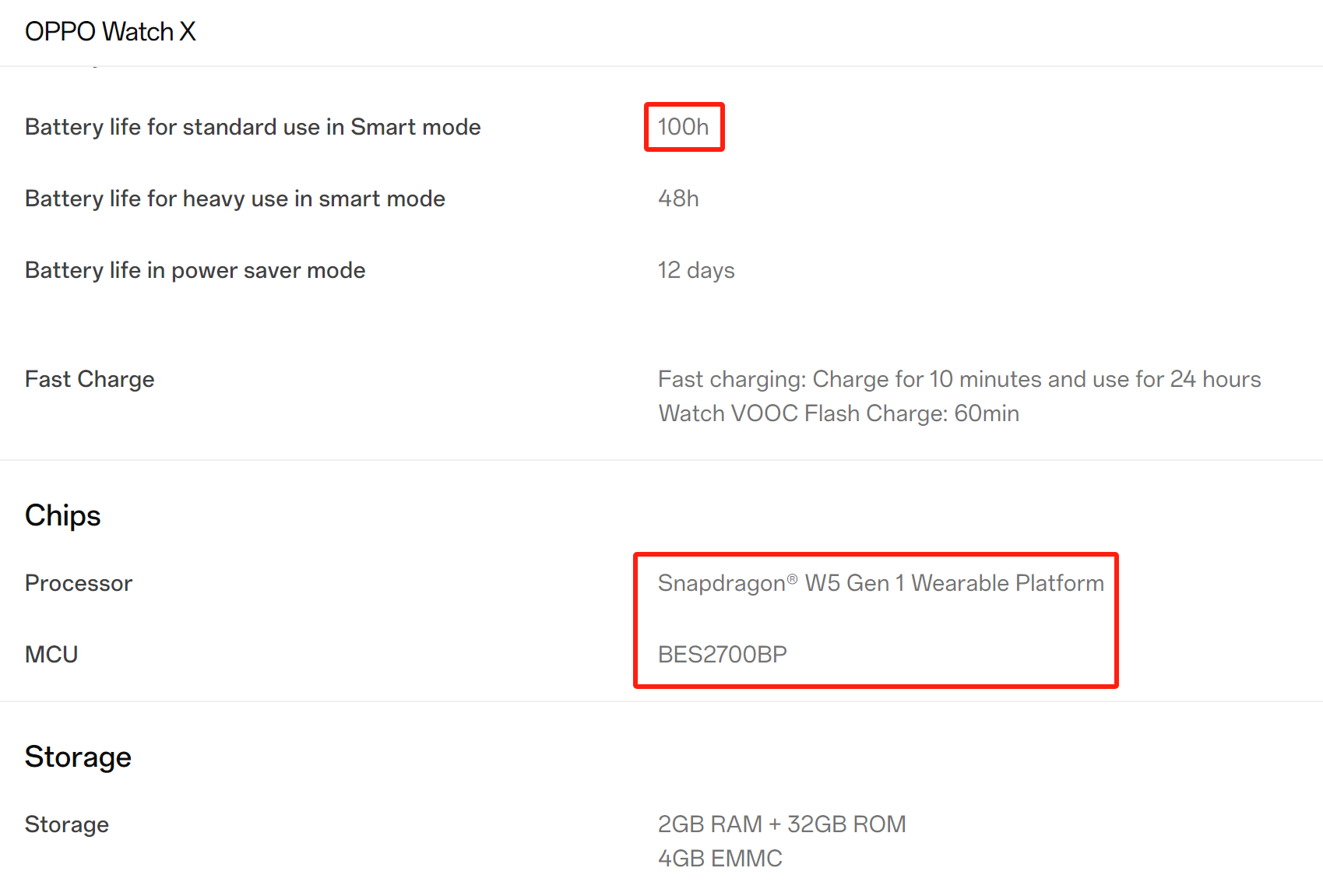 OPPO Watch X和一加手表 2都拥有1.43英寸的AMOLED屏幕,都搭载了高通骁龙 W5 Gen 1处理器。内存方面,同样是2+32GB的内存配置。至于500mAh的电池、10W充电,官方宣称的100小时最长续航也是一样的。