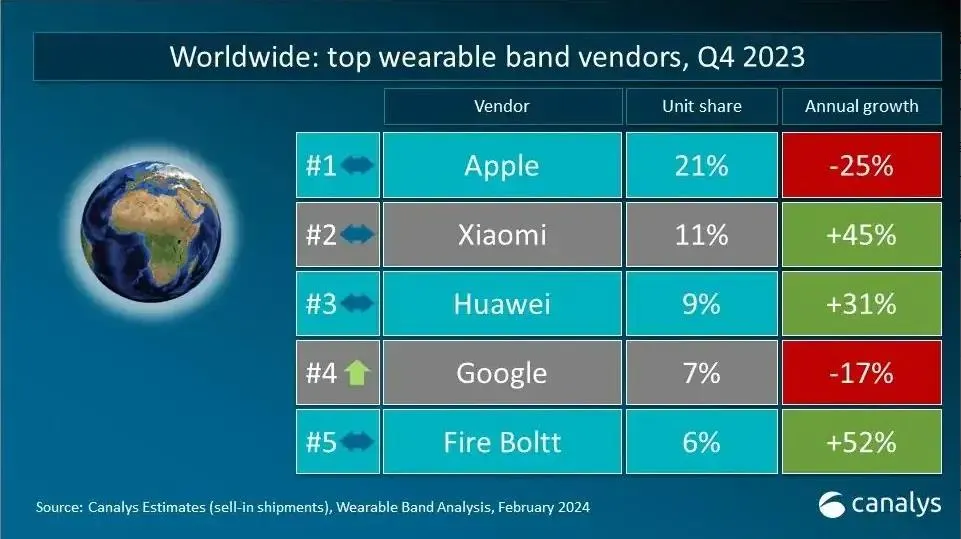 在全球市场,尽管苹果的出货量连续四个季度下降,但其市场份额仍稳居第一,达到21%。小米凭借智能手表等多品类新品,同比增长45%,市场份额跃升至11%,位列第二。华为的新品Watch GT4推动了出货量增长,同比增长31%,排名第三。谷歌和Fire Boltt分别凭借Pixel和Fitbit系列以及印度市场的价格优势,位列第四和第五。