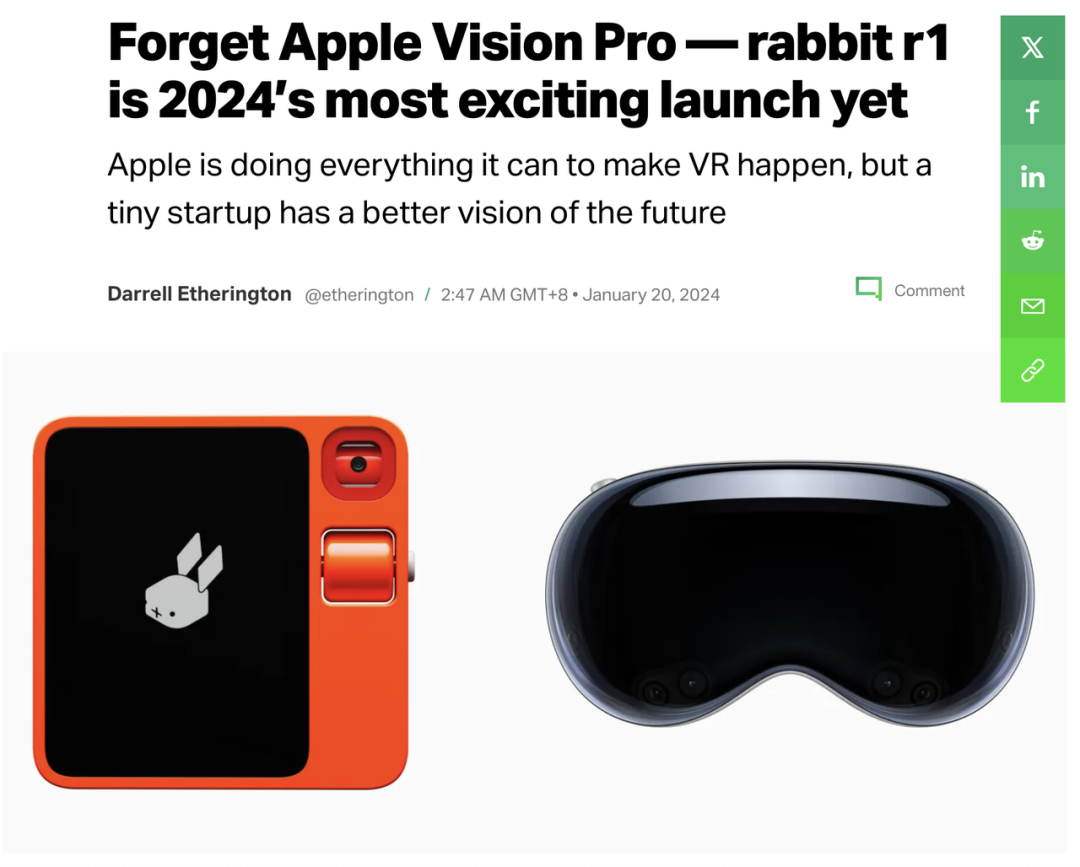 “忘了苹果Vision Pro吧,Rabbit R1才是2024至今最激动人心的发布。”