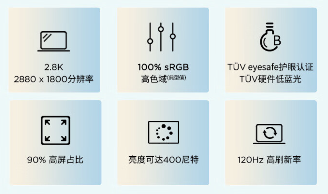 屏幕方面,这款笔记本搭载 14 英寸 2.8K 120Hz IPS 屏幕(2880 x 1800 分辨率),覆盖 100% sRGB 色域,亮度 400 尼特,采用 DC 调光,拥有 TUV 认证。
