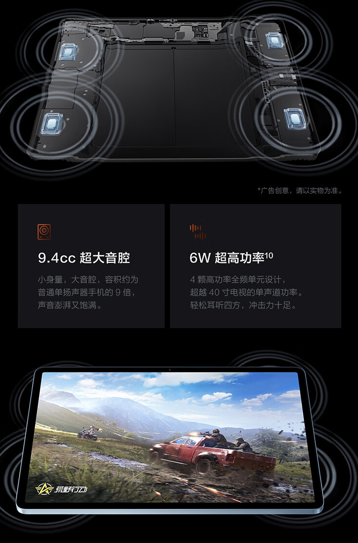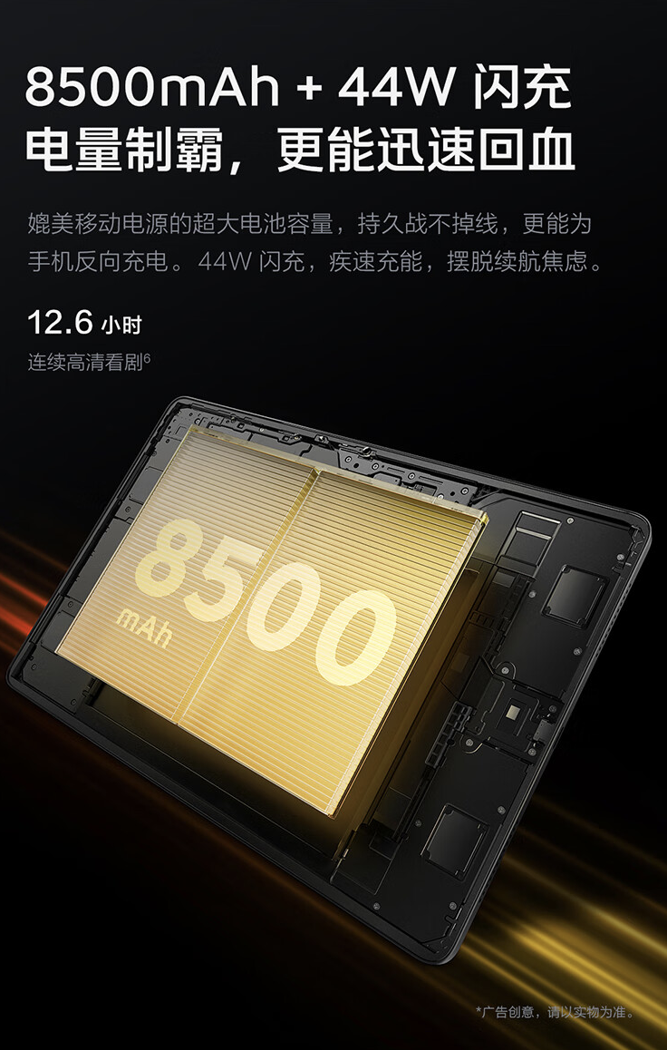此外,这款平板电脑搭载 4 个 6W 扬声器单元,支持 3D 空间音频,配备 8500 毫安电池,支持 44W 有线充电。