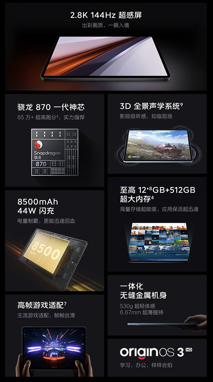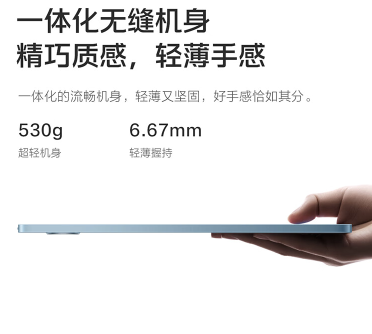 据介绍,这款平板电脑重量为 530 克,厚度 6.67mm,配备 8 核心骁龙 870 处理器,可选 8GB / 12GB RAM 及 128GB / 256GB / 512GB 存储空间。