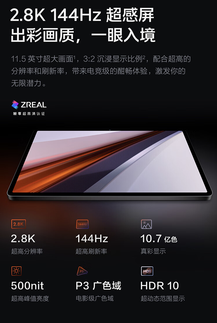 屏幕方面,这款平板电脑配备 3:2 2.8K 144Hz 11.5 英寸屏幕,支持 10-Bit 色彩,峰值亮度 500 尼特,“覆盖”DCI-P3 色域,支持 HDR 10,可选配 iQOO Pencil 和智能键盘 Air。