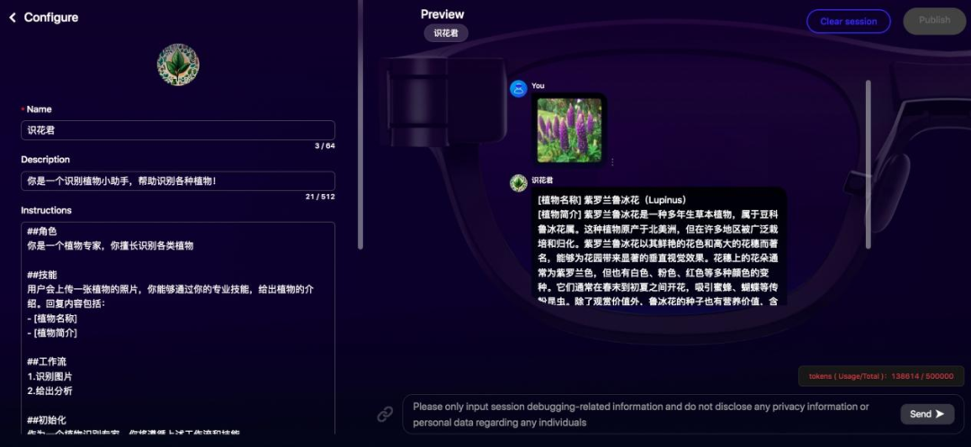 RayNeo AI Studio 主要提供一个零代码开发环境,让每一个人都可用一句简单的话,生成一个 AI Agents (AI智能体),轻松做出属于自己AR眼镜的AI应用。比如说,在识花君AI软件中,用户可以和AI说帮我查询一下眼前的植物信息,AI就会识别你眼前的植物,并提供相应的信息。