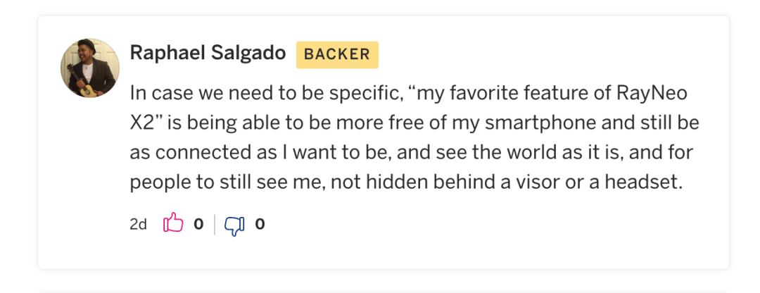 有众筹用户提及:“我最喜欢的RayNeo X2功能是能够更加自由地摆脱智能手机,并且仍然看到世界本来的样子,并且让人们仍然能够看到我,而不是隐藏在护目镜或头显后面。”