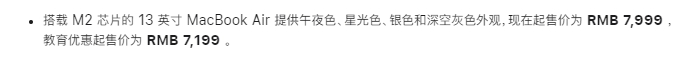 新款 MacBook Air 将于 3 月 6 日上午 9 点接受订购,3 月 8 日发售,售价 8999 元起。此外,苹果今日也停产了搭载 M1 芯片的 MacBook Air 机型,上一代 13 英寸 M2 芯片 MacBook Air 将继续销售,售价降至 7999 元起(苹果官方商城还未更改售价),15 英寸机型已停产。