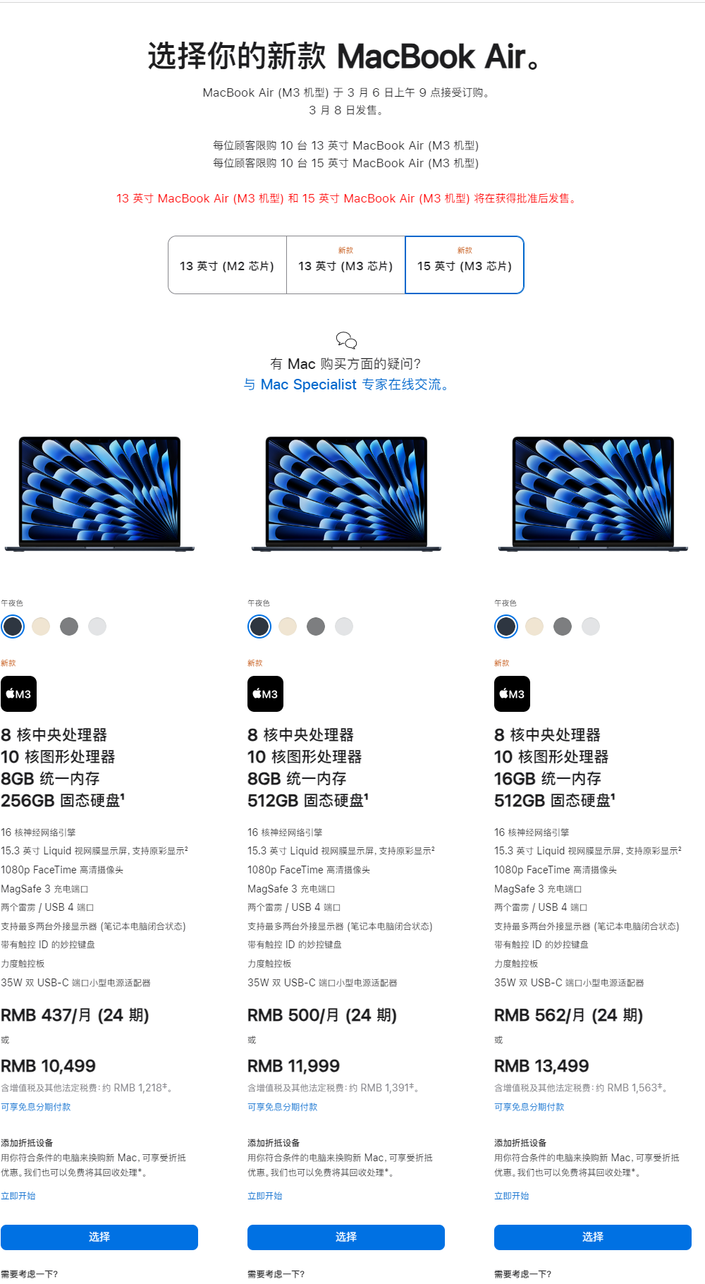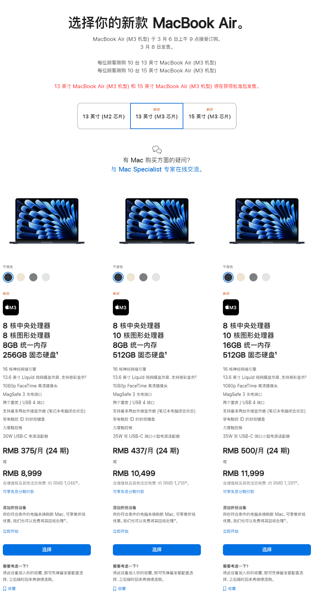 13英寸M3芯片MacBook Air起售价为8999元,15英寸机型起售价为10499元,与上一代M2系列保持相同的价格水平。值得一提的是,13英寸M2芯片MacBook Air仍在销售,售价8999元起。