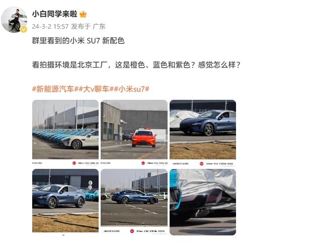 从流出的照片中,我们可以看到小米SU7新增了蓝灰、橙、暗紫三种全新配色。这些新配色在视觉效果上各有特色,蓝灰和暗紫更加沉稳,而橙色则突显了运动气息。这些新配色的加入,无疑为小米汽车增添了不少新鲜感。