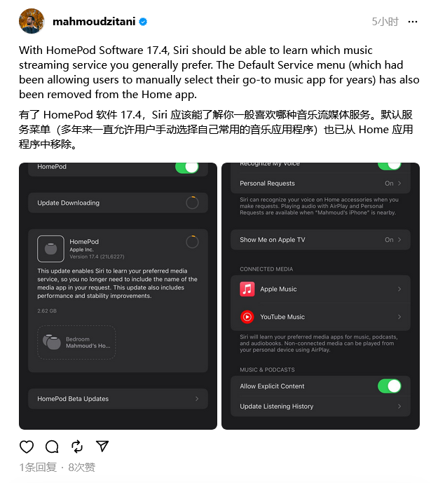 苹果在注释中写到:“此更新可让 Siri 学习你偏好的媒体服务,因此你不再需要在请求中包含媒体 App 的名称。此更新还包括性能和稳定性方面的改进。”