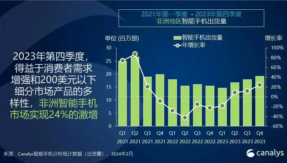 今日,研究机构Canalys发布报告指出,2023年第四季度,非洲智能手机市场呈现出显著复苏态势,出货量同比增长24%,达到1920万部。这一增长趋势在全年内也持续显现,全年出货量达到6870万部,较2022年增长6%。