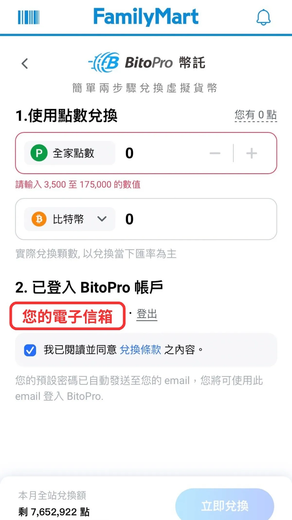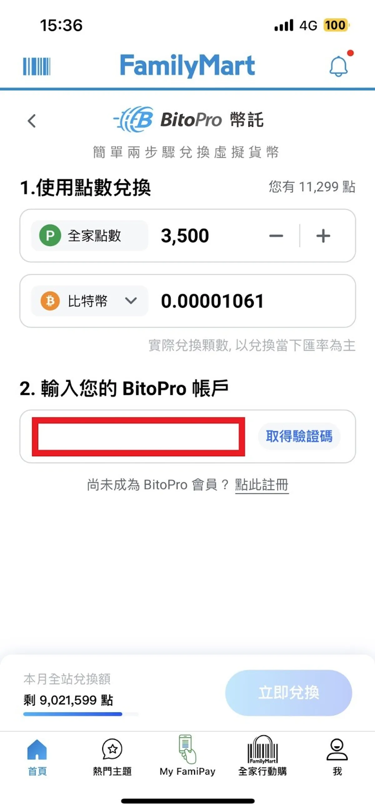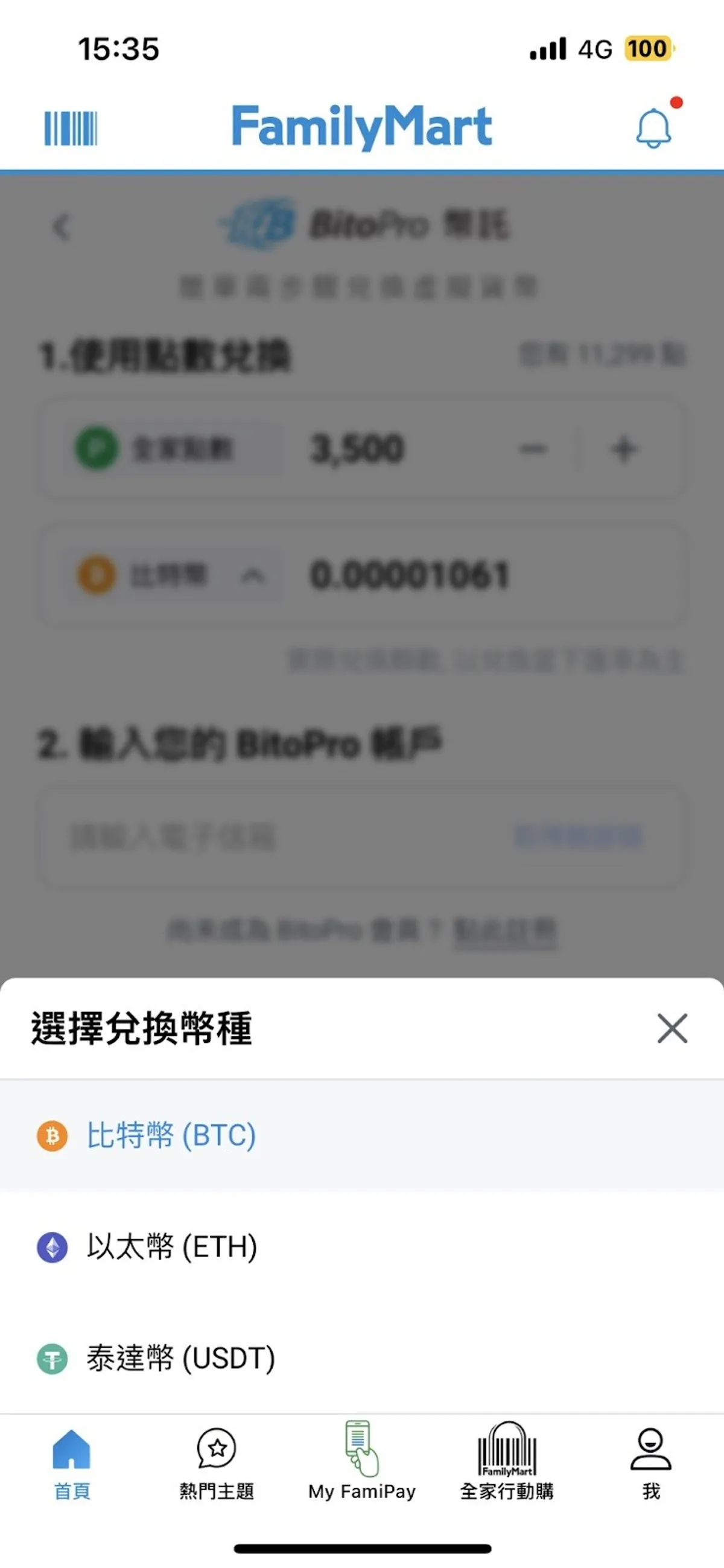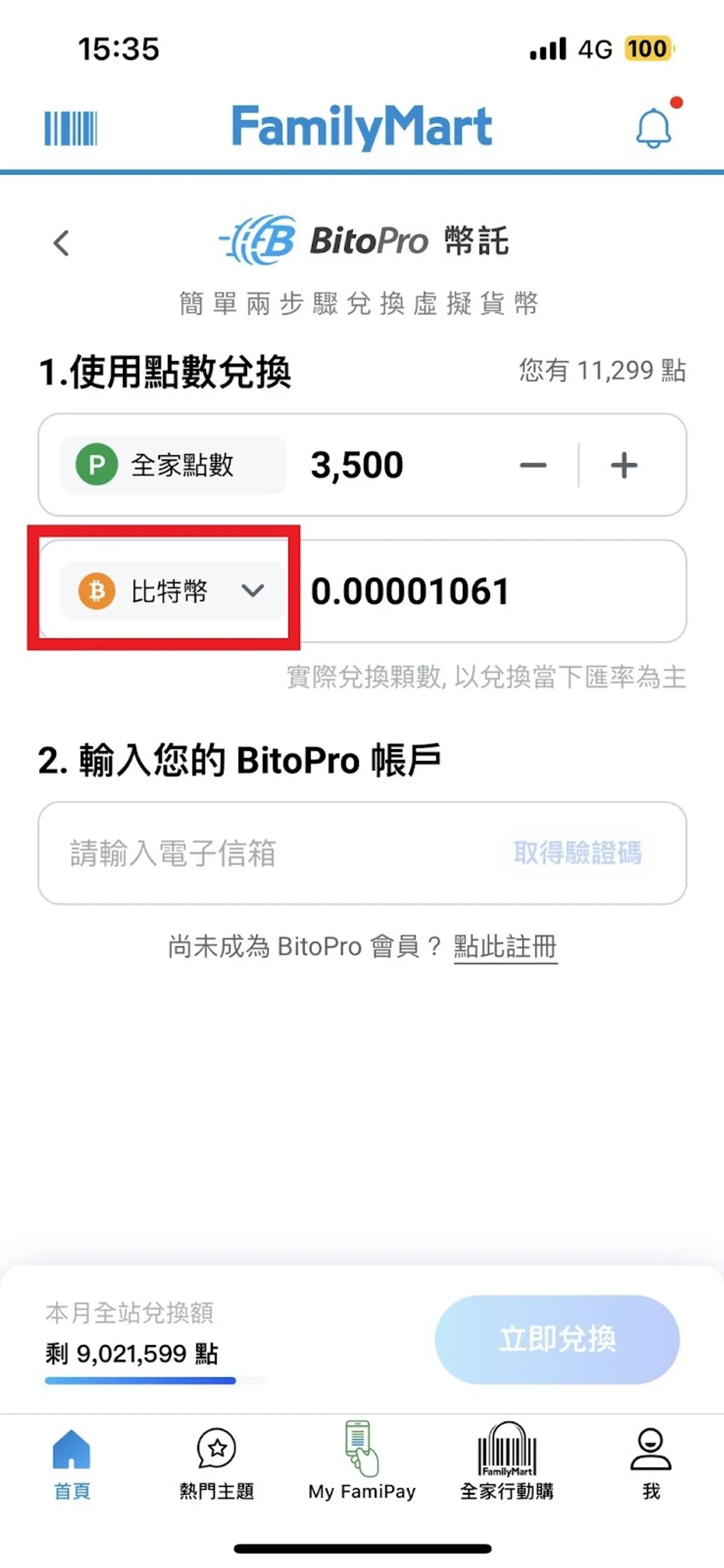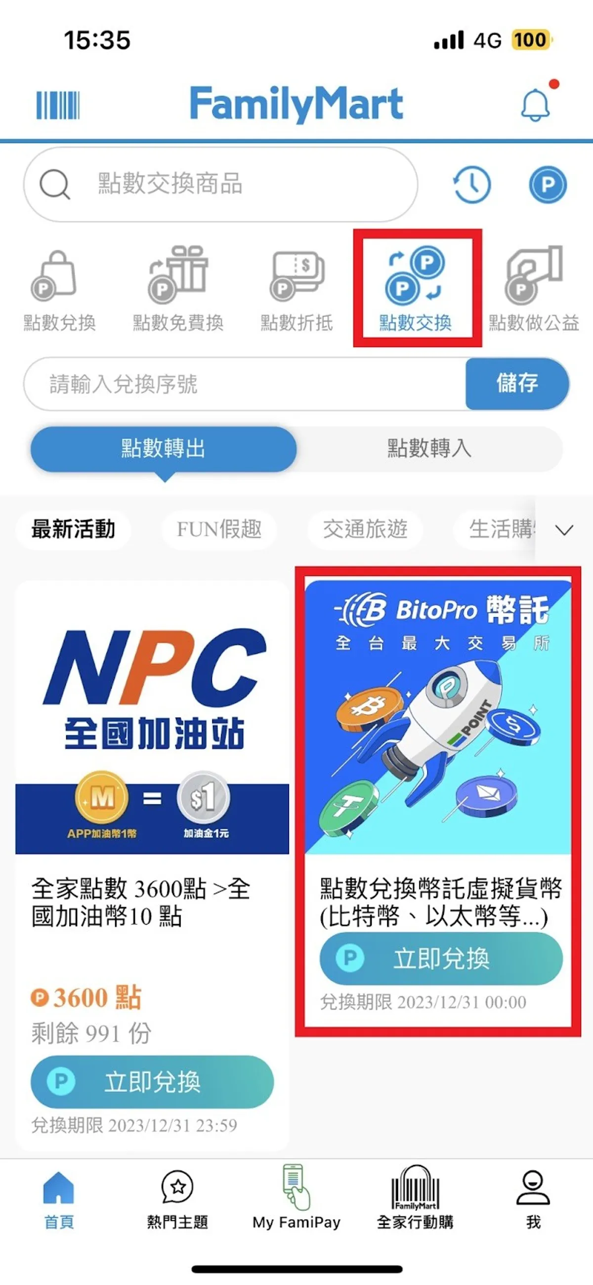打开FamilyMart App,点击主页面的“兑点趣”或“我的点数”,进入“点数交换”专区,找到“点数兑换幣託虚拟货币”并点击进入。