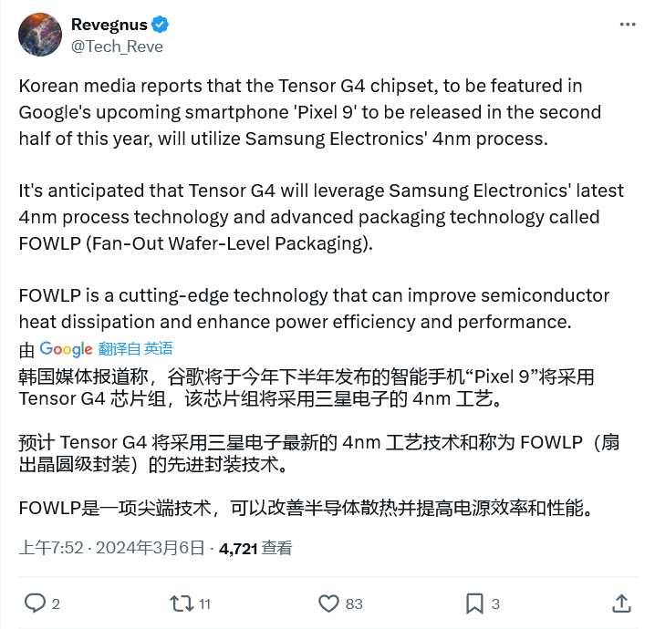报告表示谷歌 Tensor G4 芯片采用三星的 4nm 工艺量产,但目前尚不确定采用哪种工艺,不过外媒推测大概率是 4LPP+ 节点。