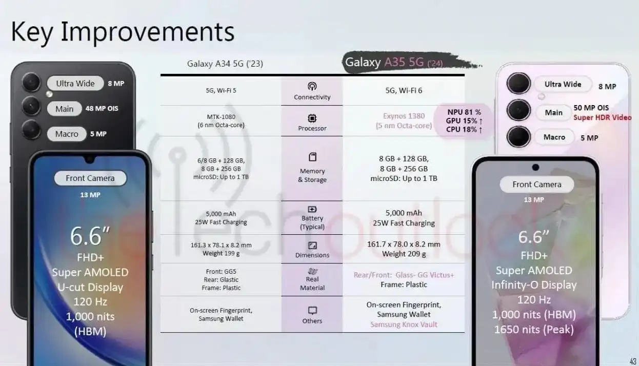 首先,我们来看看即将发布的Galaxy A35。据悉,这款手机将配备Exynos 1380处理器,6.6英寸的120Hz Super AMOLED屏幕,以及8GB的RAM,存储空间则有128GB和256GB两种选择。在拍照方面,Galaxy A35后置50MP主摄、8MP超广角和5MP微距三摄组合,前置摄像头为13MP。同时,这款手机还配备了5000毫安时的大容量电池,支持OneUI 6.1系统(基于Android 14)。