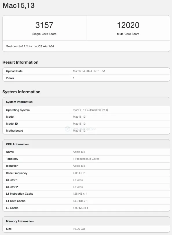 值得注意的是,现身跑分网站的15英寸MacBook Air是16GB内存版本,苹果还提供了8GB、24GB内存可供选择,最高提供2TB存储空间,出厂预装MacOS Sonoma系统。